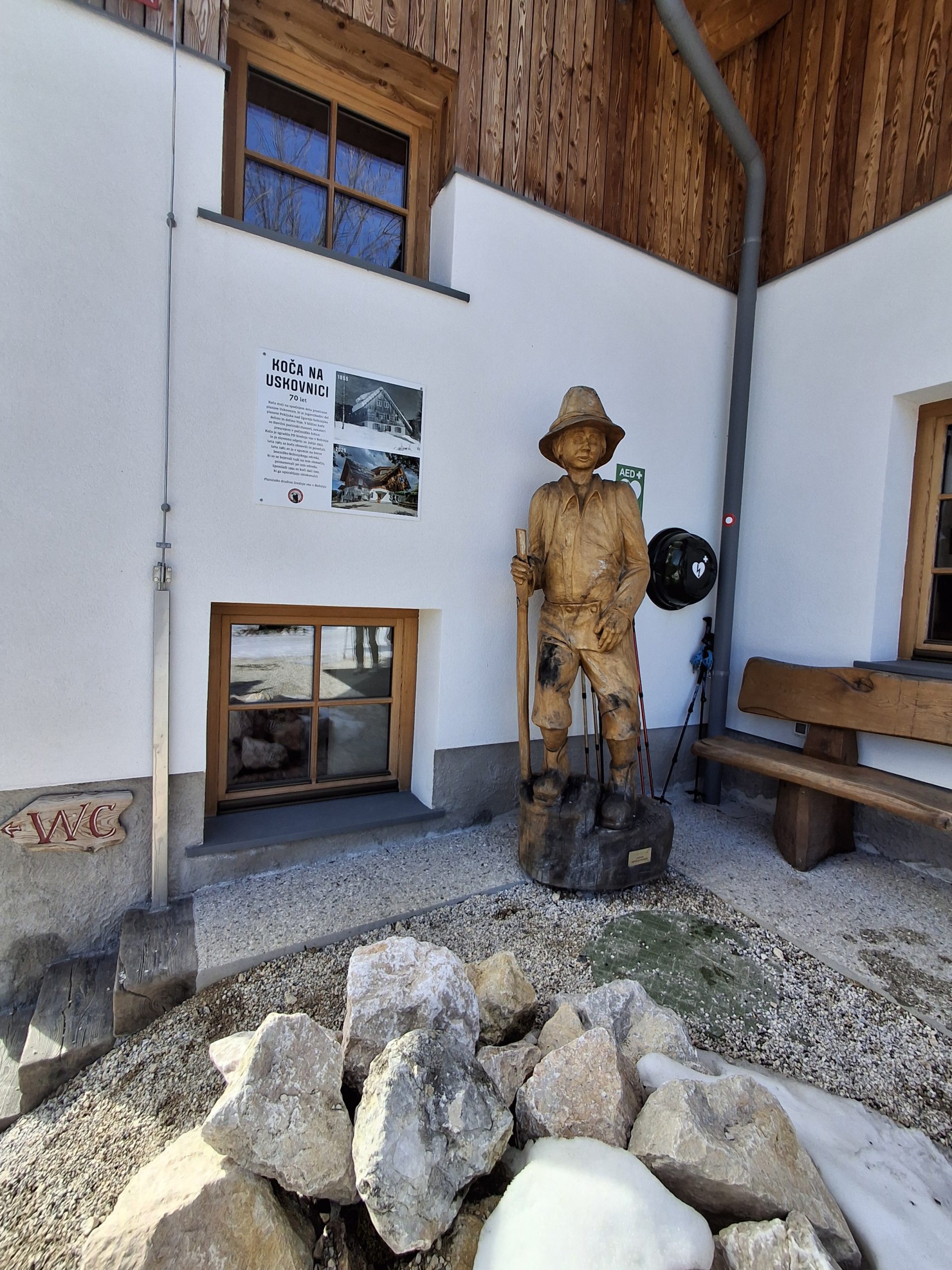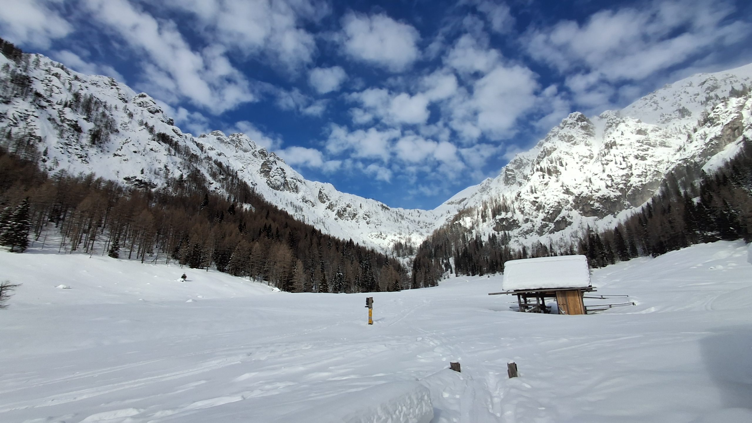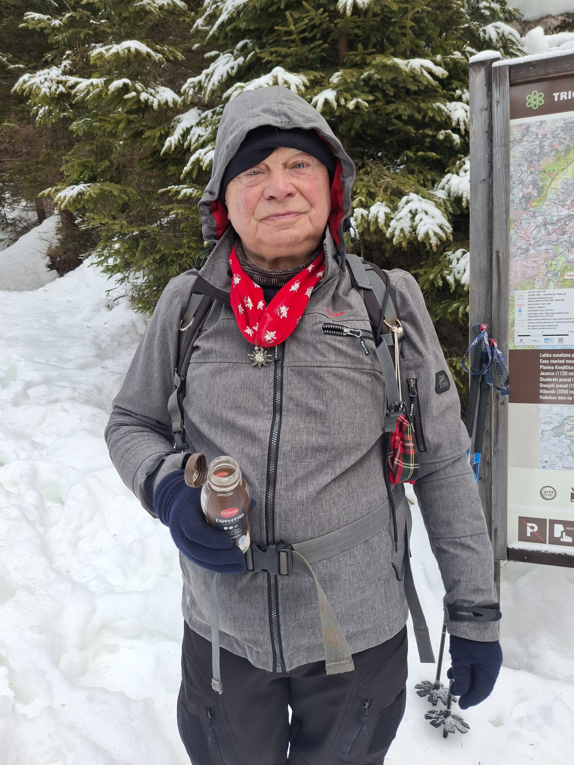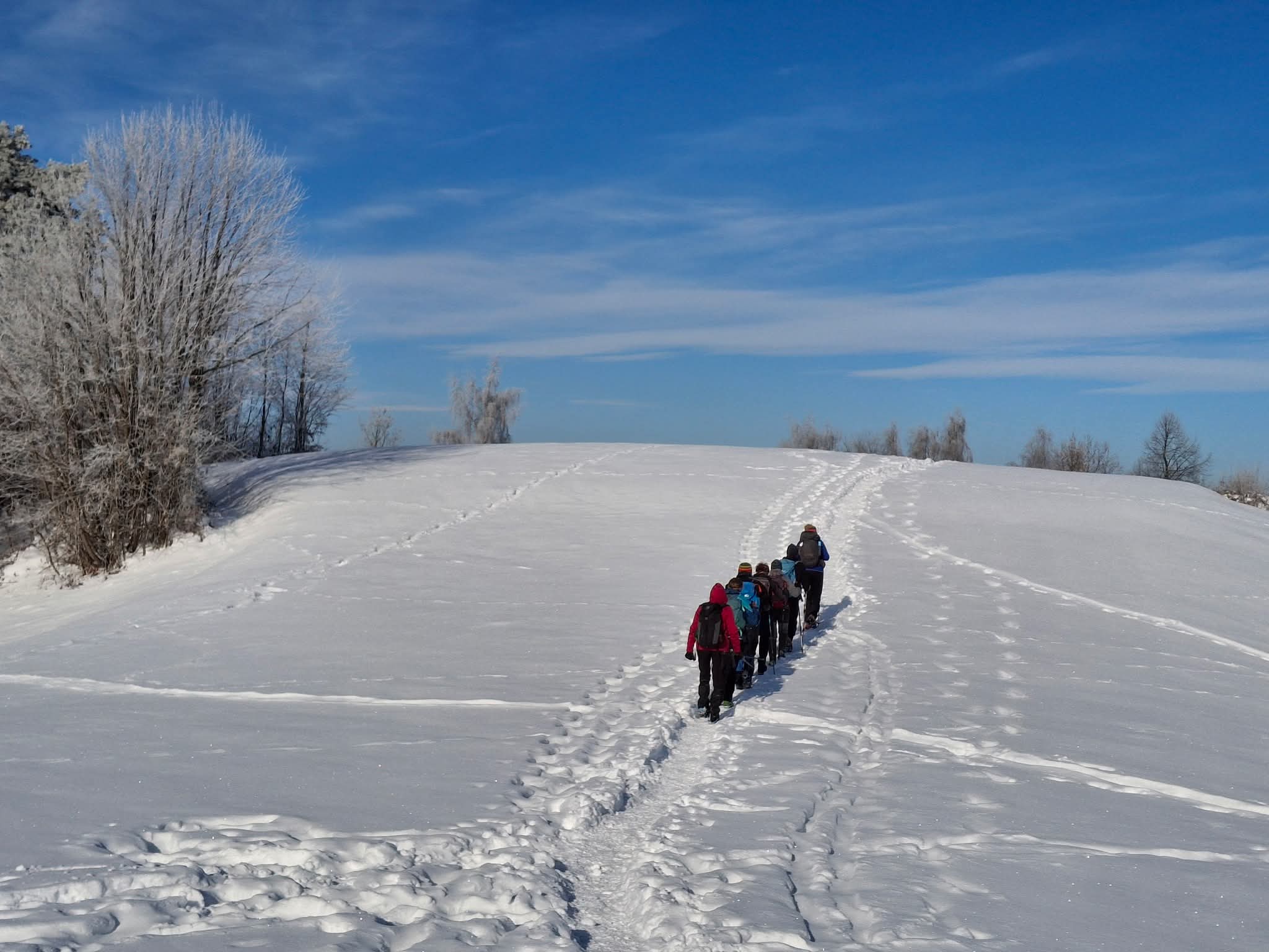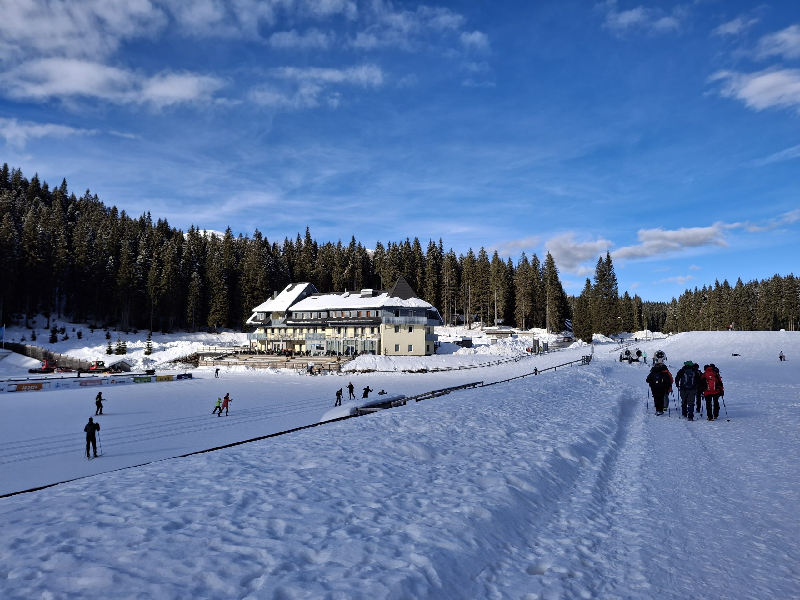 Parkiramo, naredimo kratko pavzo v hotelu nato po poti za pohodnike, med tekaškimi smučinami, zakorakamo po škripajočem snegu.