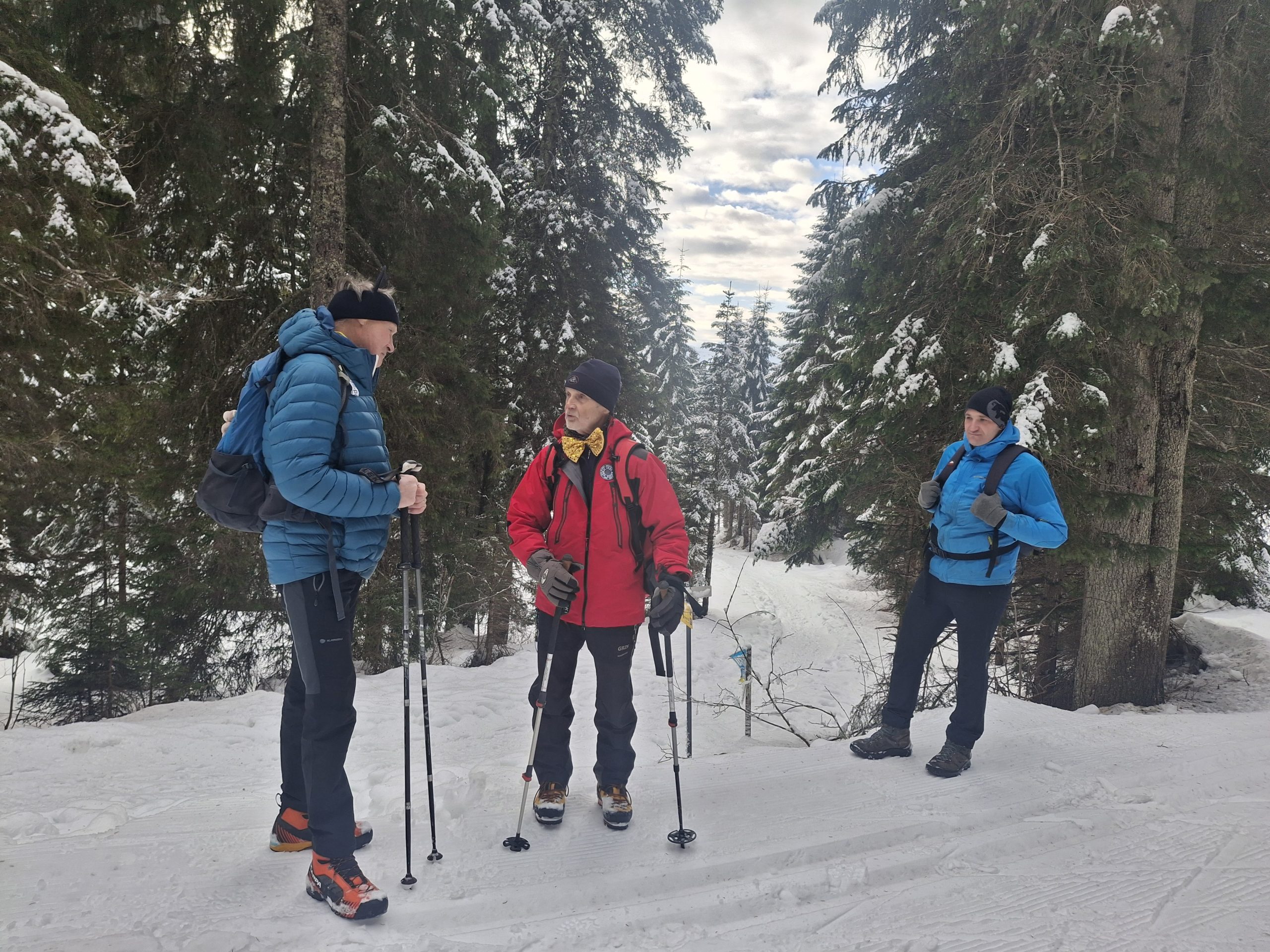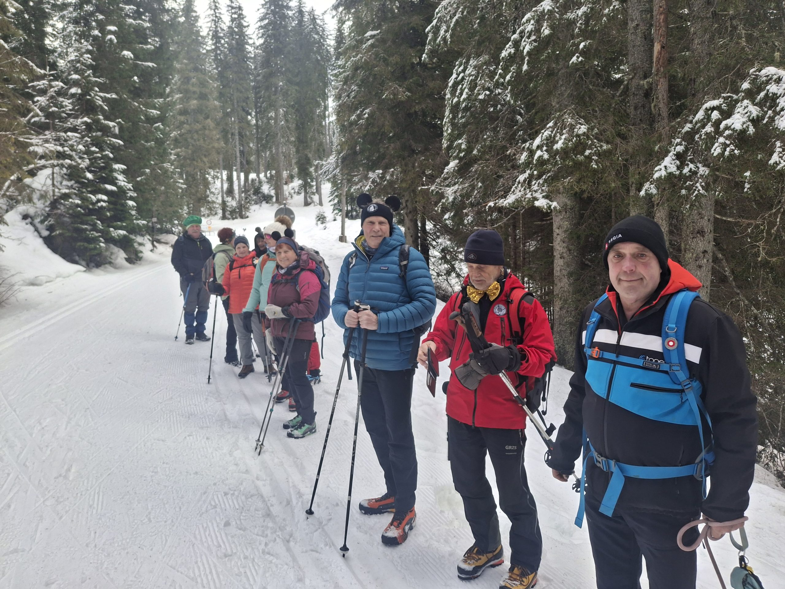 Razdelimo se, dve planinki gresta direktno na Uskovnico, trije planinci in kužika gredo pred nami, da so nam naredili gaz, večja ekipa pa z zmernim tempom do odcepa za Planino Konjščica.