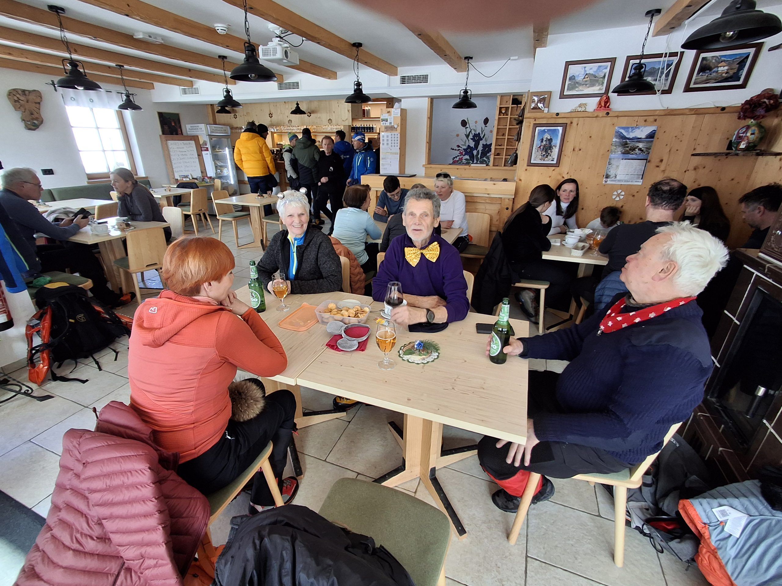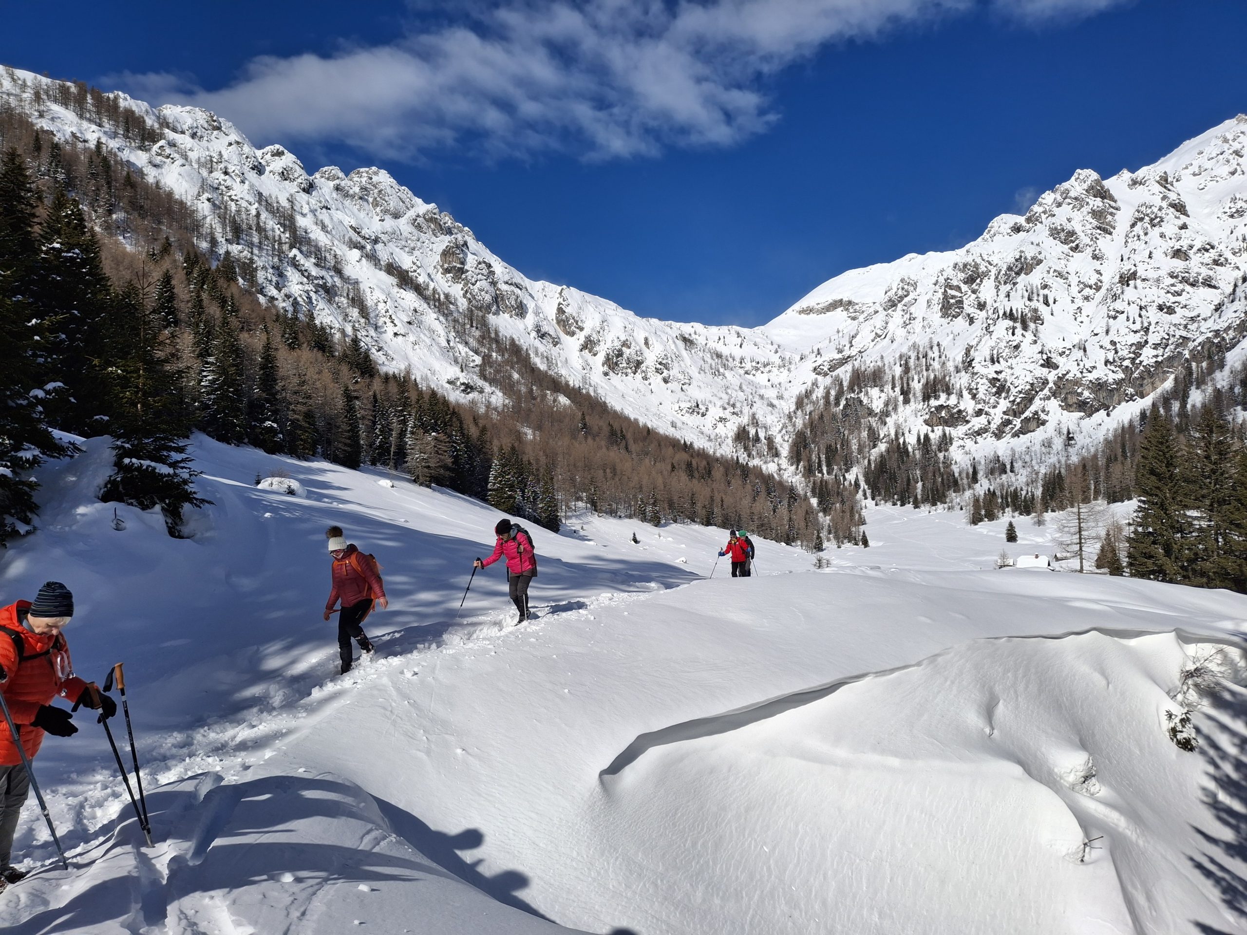 Počitek v koči, topel obrok na  izbiro in že si nadenemo dereze in odidemo proti Pokljuki. Bil je dan, ko smo z užitkom hodili po svežem snegu, včasih malce pomrznjenem, dan za občudovanje vrhov obsijanih s soncem, veliko smeha in norih zgodb.