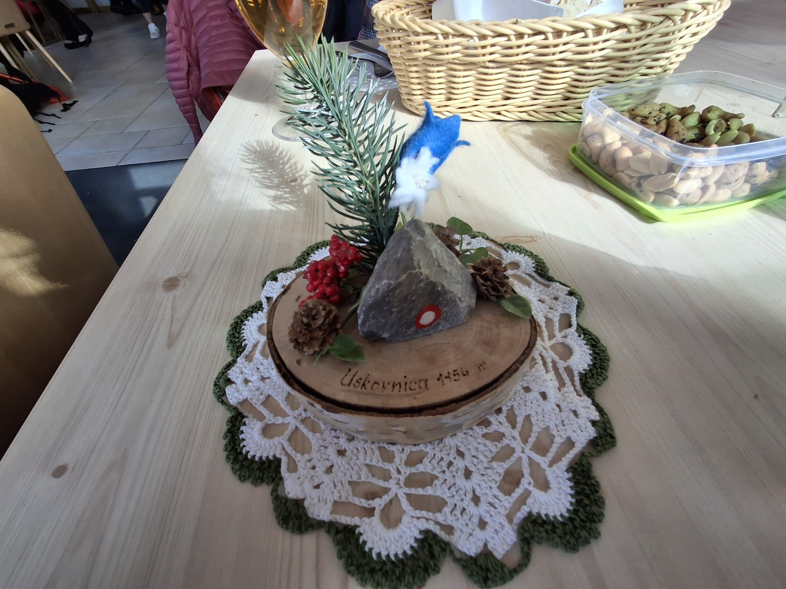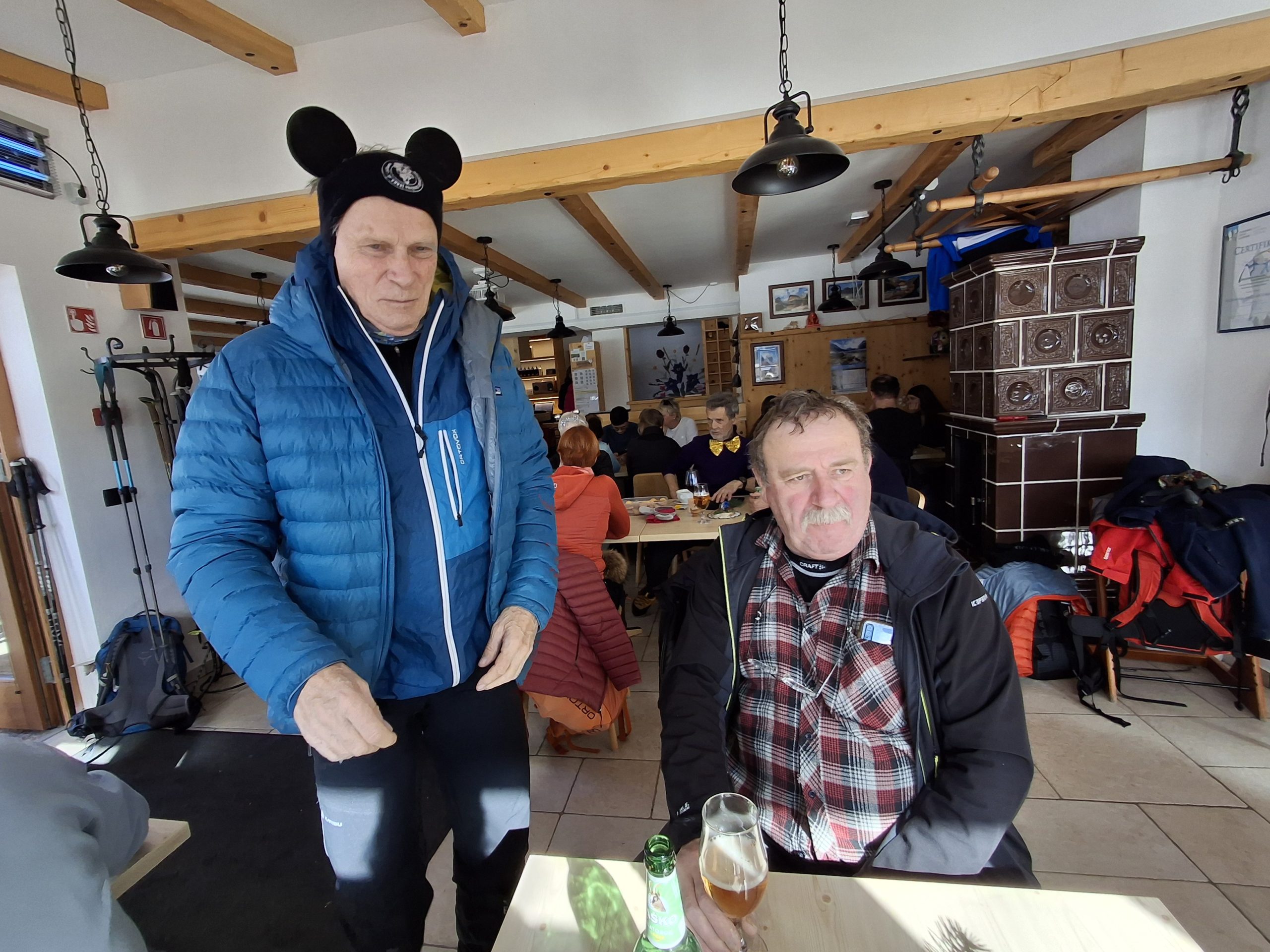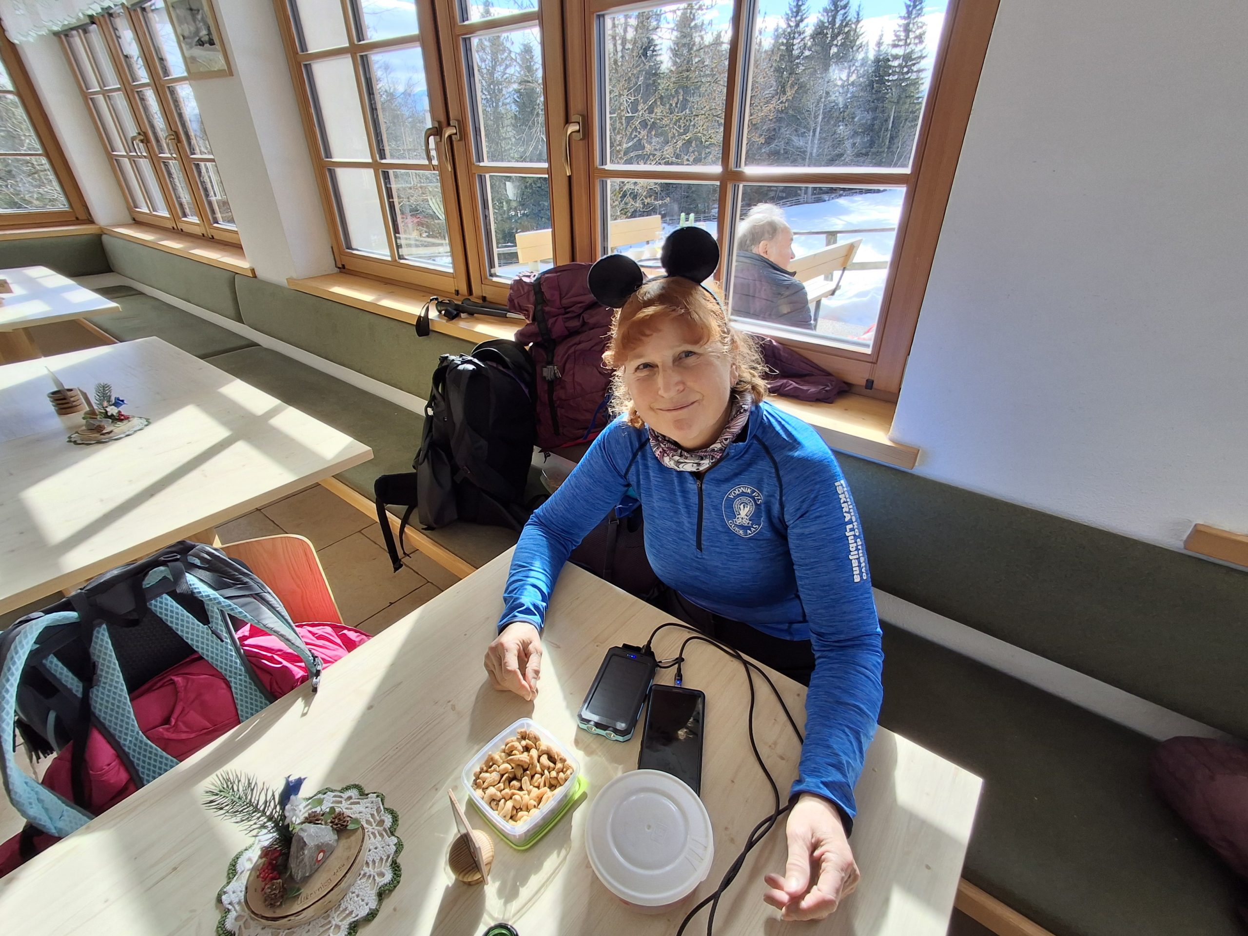 Zasneženi in obsijani s soncem, smo nekaj malega pojedli na planini,  termometer – 6 stopinj.
