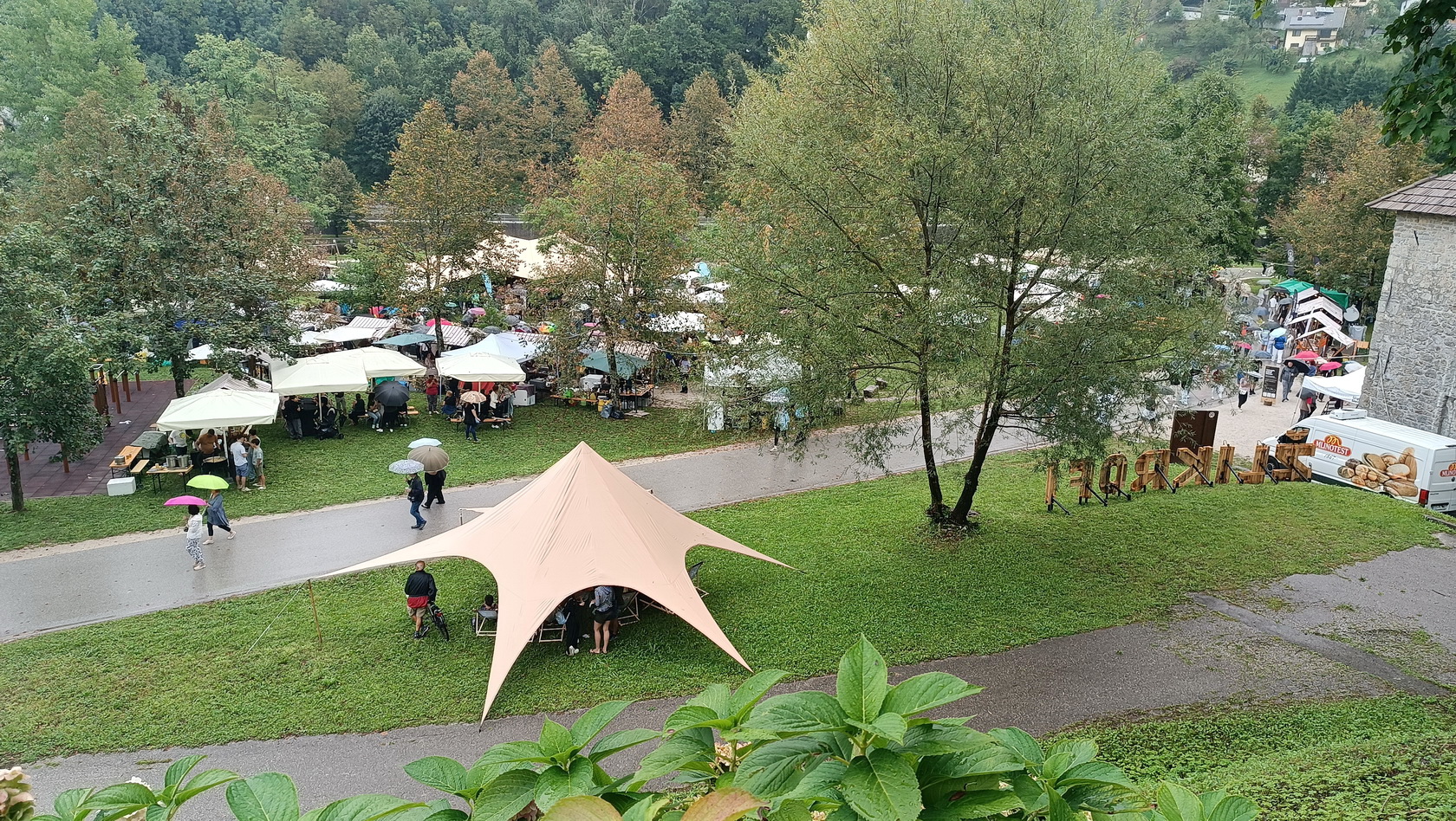 Na koncu poti smo se na hitro sprehodili pod dežniki čez Scopolijev vrt, ki predstavlja delo in raziskovanje G. A. Scopolija, rastlin, živali na področju Julijskih alp, Bohinjskega dela, Konjščice, Velega polja in Porezna kamor je rad zahajal. Ker je kot prvi rudniški zdravnik služboval v Idriji, je iskal načine za ozdravljenje težav in bolezni, ki so se pojavljale pri boleznih rudarjev. Žal opisa njegovega dela in vodenja po njegovem parku ni bilo- višja sila -dež in opojne vonjave iz prizorišča spodaj, saj je bil praznik Idrijskih žlikrofov ato se je naše popotovanje zaključilo v raziskovanju ponudbe na štantih.