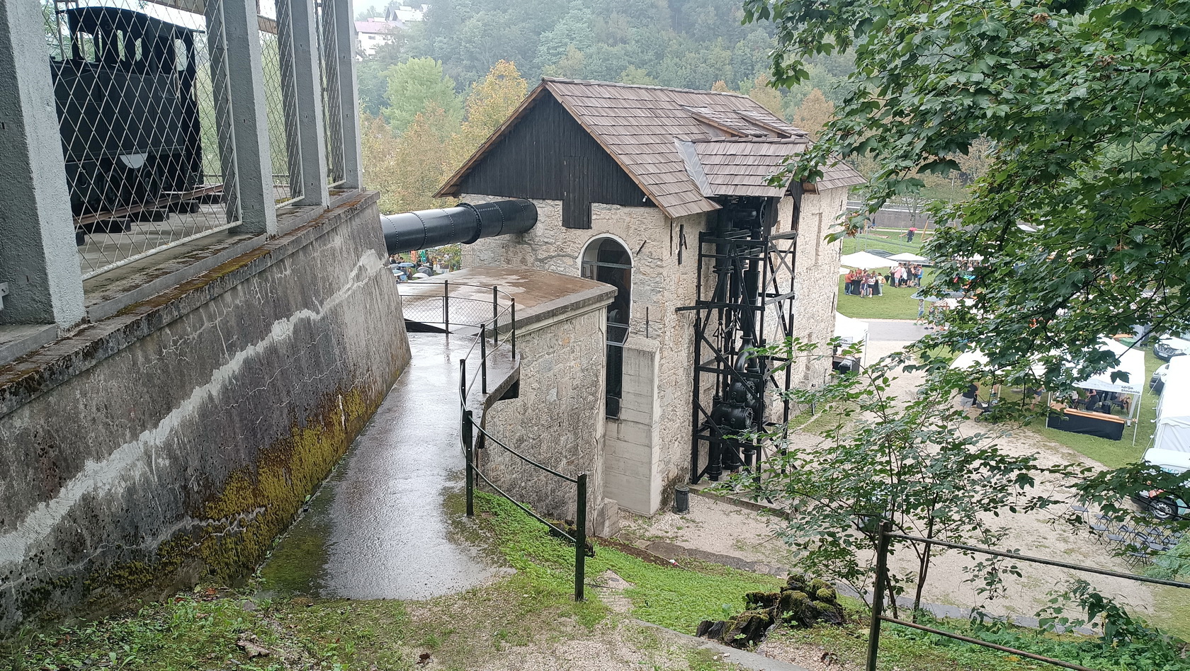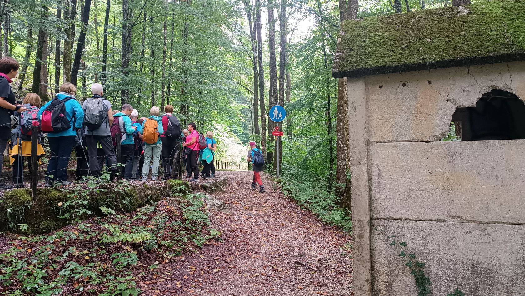Po tem kanalu je bila speljana voda, ki je poganjala veliko leseno kolo, ki v premeru meri 13,6m in je črpalo vodo iz vseh nivojev rudnika, saj je bilo vdiranje podtalnice velika težava v rudniku. Žal nas ob našem sprehodu ni spremljalo žuborenjje črpane vode, ker enkrat letno čistijo kanal, a nekateri smo si sami to pričarali. Ob poti je bilo par vidnih ostankov bunkerjev iz obeh vojn in seveda tudi studenčka izvirske vode, kot nam je omenil vodič iz nje pripravljajo pijačo, znano za ta kraj – Geruš.